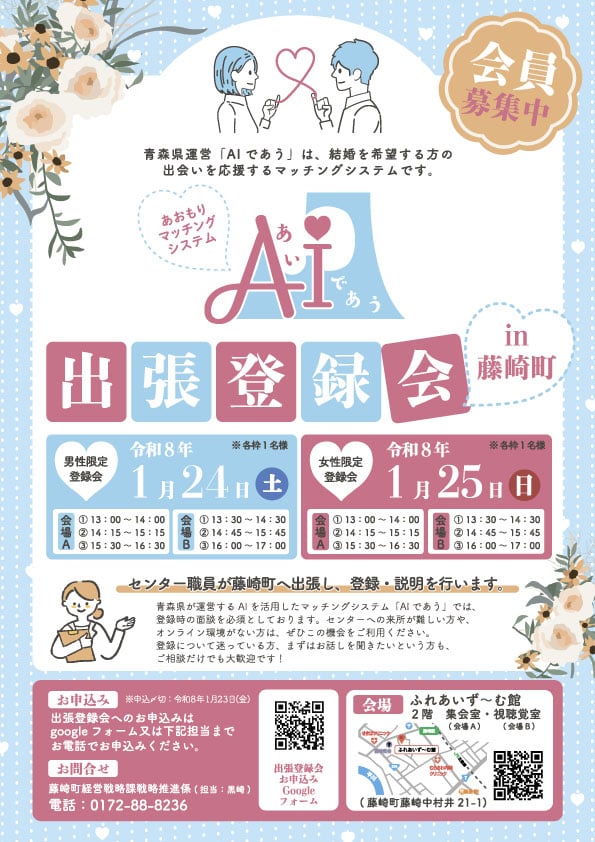 | 申込方法 | 下記応募専用フォームからお申込みください。 応募専用フォーム 「senryaku@town.fujisaki.lg.jp」受信できるように設定をお願いします。 ※あおもり出会いサポートセンターでは出張登録会のお申込みを受け付けておりません。必ず、応募フォームより藤崎町様へお申し込みください。 |